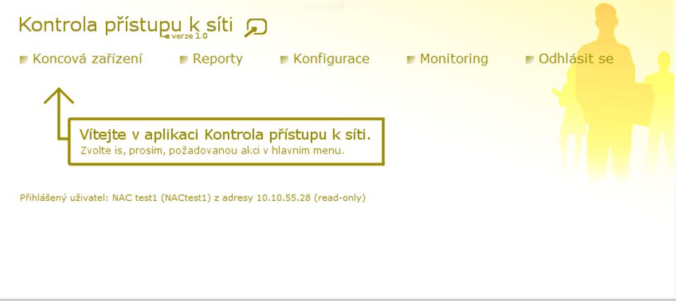 Aplikace by však měla bez obtíží fungovat v libovolném moderním grafickém prohlížeči s podporou cookies, CSS a skriptování v Javascriptu. Přístup přes textové prohlížeče podporován není. Podmínkou správné funkce aplikace je povolit soubory cookies pro NAC server. Prohlížeče disponující pokročilými funkcemi zabezpeční mohou navíc vyžadovat přidání serveru mezi důveryhodné. Úvodní stránkaJestliže integrované přihlášení úspěšně proběhne a právě přihlášený uživatel MOSS má v aplikaci NAC práva, zobrazí se hlavní stránka aplikace (Obrázek 1).