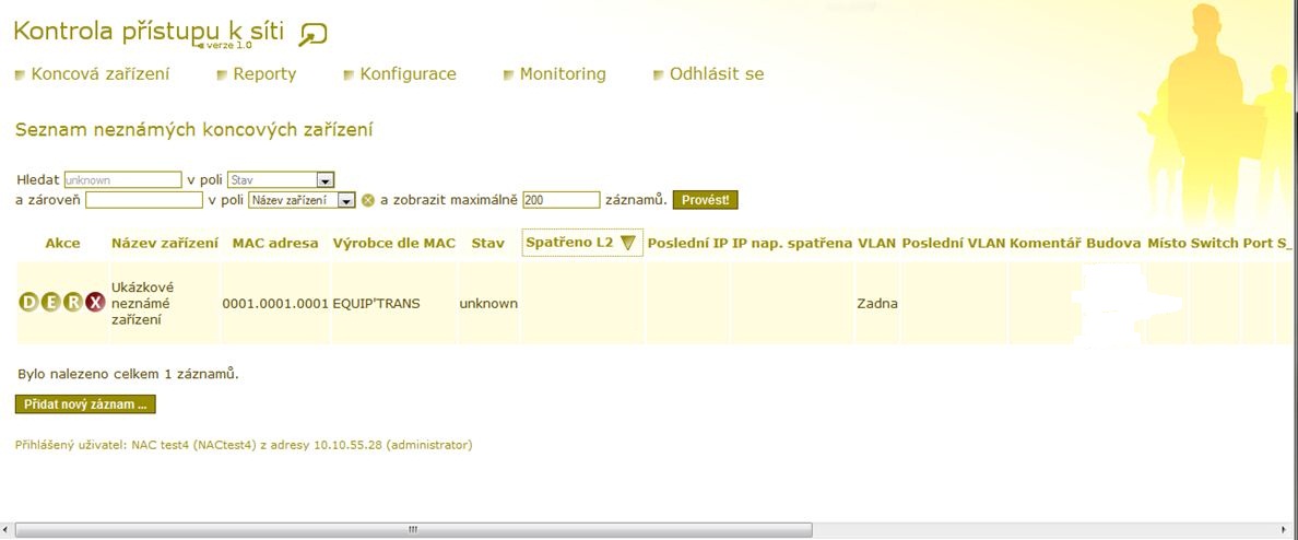 Neznámá zařízeníSekce „Neznámá zařízení“ zobrazuje všechna koncová zařízení, která mají status "unknown" (Obrázek 4). Jedná se o ta zařízení, která se nově objevila a NAC server se s nimi ještě nesetkal. Tato stránka tedy slouží zejména ke kontrole, zdali se v síti objevují nová a případně neautorizovaná zařízení.