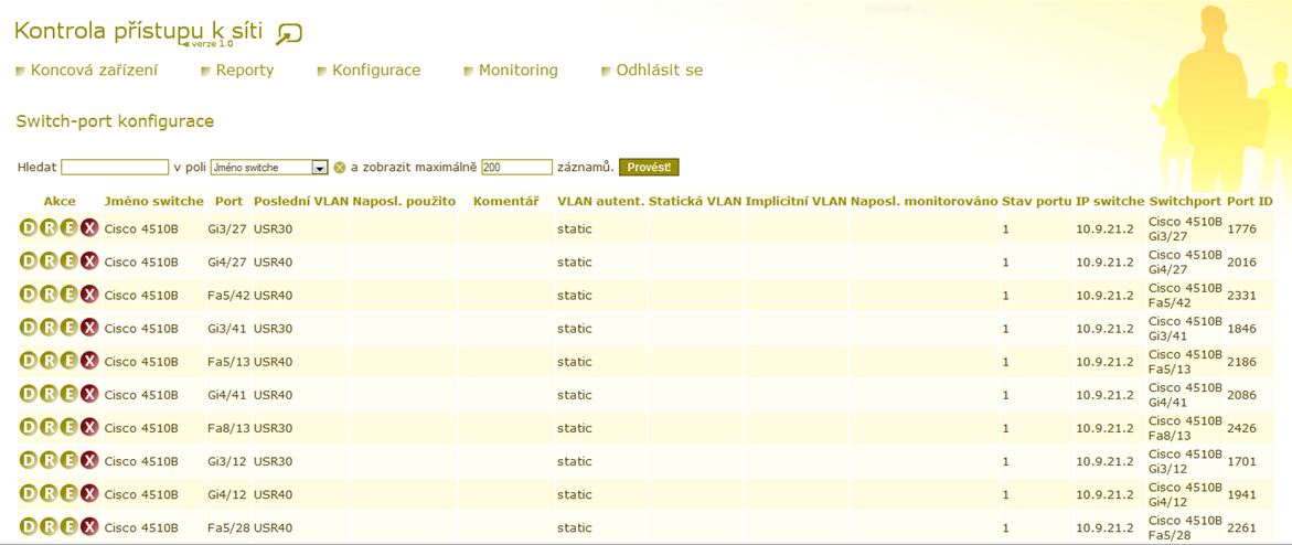 KonfiguraceMenu konfigurace slouží k editaci switchů a portů a také k nastavení aplikace NAC včetně editace číselníků. Dostupné akce jsou závislé na roli uživatele. Menu obsahuje následující položky:
