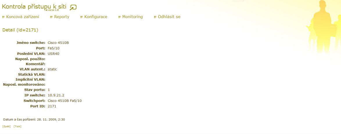 Základní informaceZákladem celého systému je dedikovaný NAC server. Ten obsahuje vlastní databázi, webserver i interpretery použitých skriptovacích jazyků stejně tak jako širokou paletu software využívaného ke komunikaci se síťovými prvky, monitorování sítě a zajištění dalších funkcí aplikace. Server používá variantu oblíbeného operačního systému Red Hat Enterprise Linux (RHEL). NAC 1.0 je nadstavbou standardně nasazovaného řešení FreeNAC. Přístup do aplikaceDo aplikace se přistupuje přes jednotné rozhraní intranetu Microsoft Office Sharepoint Server (dále jen MOSS). Přímý přístup, např. zadáním URL aplikace do prohlížeče možný není, neboť přihlášení do aplikace probíhá integrovaně (tj. bez ručního zadávání uživatelského jména a hesla), přičemž přihlašovací údaje se zabezpečeně předávají právě z prostředí MOSS. Práva a roleS aplikací mohou pracovat jen Ti uživatelé, kteří mají patřičná přístupová práva. Ta jsou řízena pomocí členství ve skupinách v adresářové službě a mohou je přidělit odpovídající administrátoři. Aplikace rozlišuje tyto základní čtyři role: