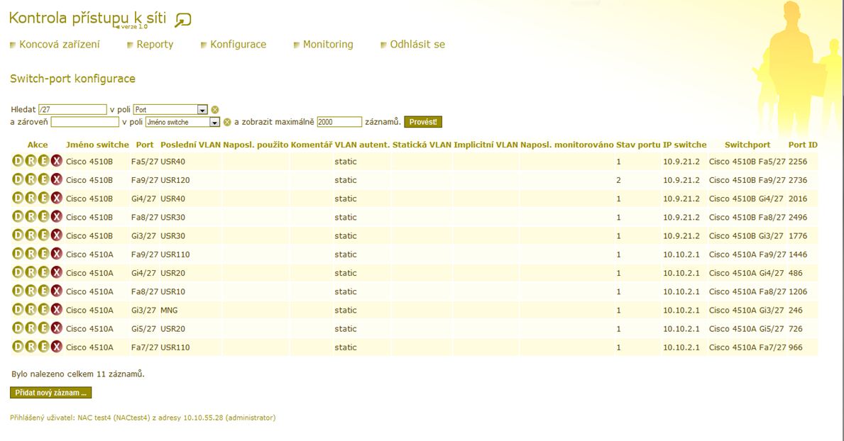 Switch-portSwitch-port konfigurace slouží k přidávání, úpravám a odstraňování portů jednotlivých switchů. Tato sekce je realizována formou standardní tabulky (Obrázek 6), jak byla popsána v kapitole Uživatelské rozhraní a je editovatelná uživateli v roli administrátor a editor.